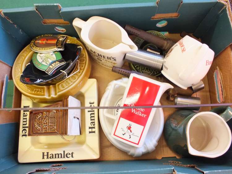 Various pub jugs, ashtrays, IPA and Abbott pump clips and a vintage Reeves metal barrel measure