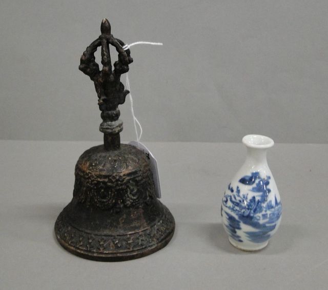 Vas, Kina 1800-tal H8cm samt rituell klocka s.k. Ghanta, Tibet omkring 1900 H16cm, handtag med äldre lagning