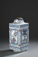 En porcelaine bleu, blanc et rouge de cuivre, de forme quadrangulaire, décoré sur chaque face de cervidés et paysages, entouré de rinceaux feuillagés et pivoines, l’arrête de l’épaulement ornée de grecques et frise de ruyi, celle de la base, de pétal