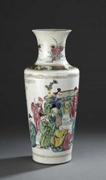 De forme rouleau, le col évasé, à décor de dignitaires auprès d’un arbre, le col émaillé de lingzhi (col restauré). H. 42 cm