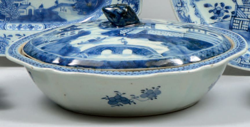 Vegetable cover of the East India Company in white porcelain blue lake landscape decor.