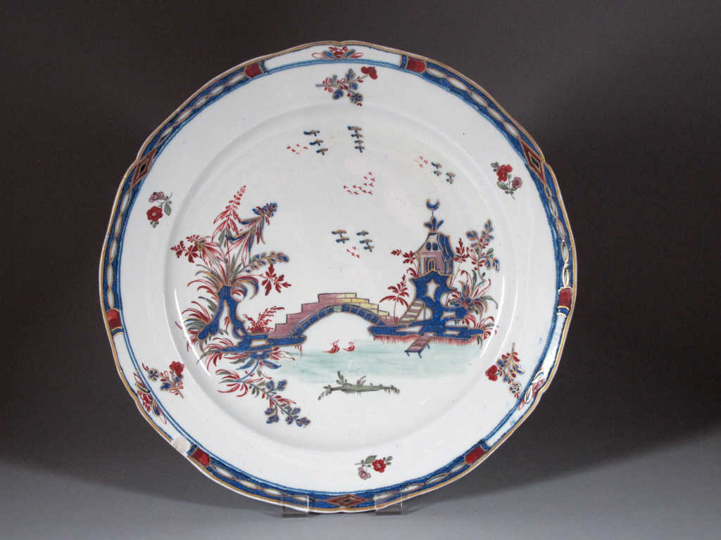 Flowering twigs on the wing. Galon blue background with three flowers reserves over the edge. Brand: anchor in red on the back, Cozzi factory. Eighteenth century, around 1770-1775. Diam. : 31.2 cm. (A burst on the edge)