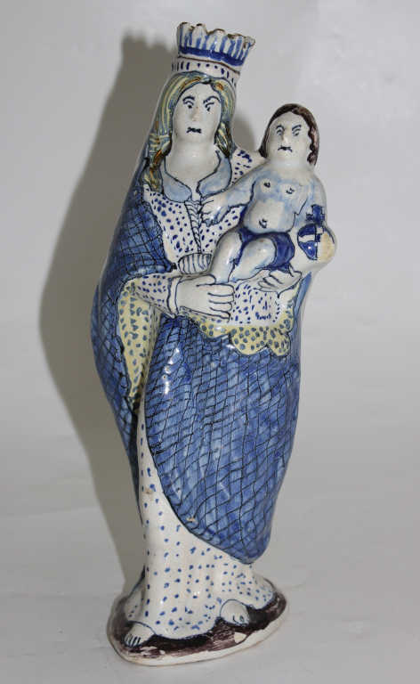 Vierge en faïence polychrome à décor en camaïeu de bleu et manganèse,