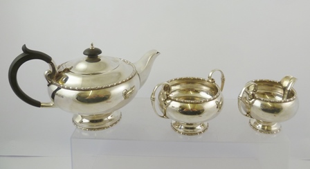 WALKER AND HALL A MID 20TH CENTURY THREE PIECE SILVER TEASET with beaded rims, comprising; teapot, milk jug and sugar bowl, Sheffield 1960, overall weight 1024g (including non silver teapot handle and knop)