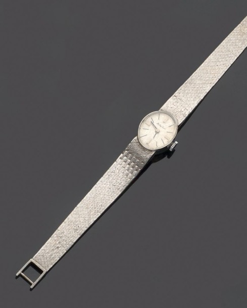 Wristwatch pressed white gold, MM 750, oval window, stick figure, gray background, mechanical movement