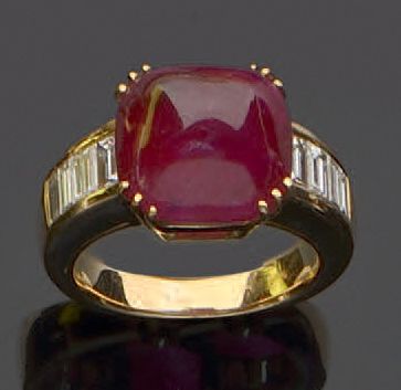 Yellow gold ring, 750 MM, adorned with a rare rubies "sugar loaf, cushion Russian sides" weighing 11.97 carats Origin: Burma