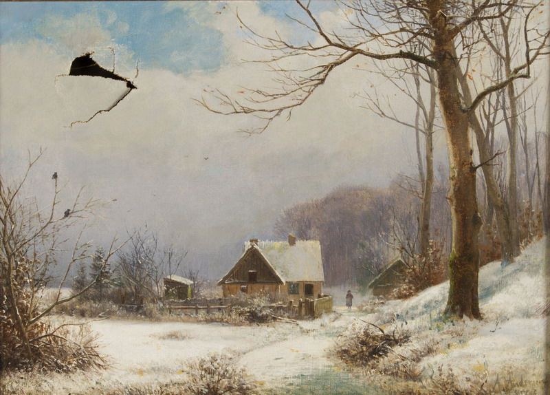 | winter landscape scene with lone figure beside woodland cottage on edge of snow covered forest | |