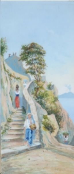 | Bauersleute, die eine Treppe hinabsteigen, im Hintergrund der Vesuv und Blick auf eine Straße an einem Gewässer | |