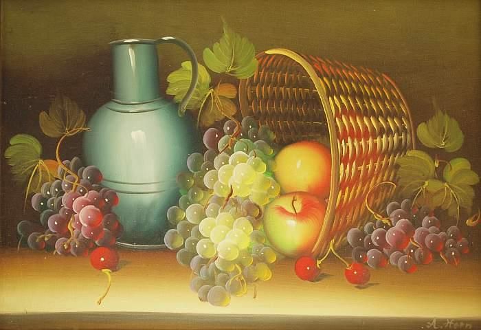 Früchtestillleben mit Schenkkrug und Weidenkorb