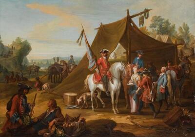 | A MILITARY ENCAMPMENT, DEPICTING THE HOUSEHOLD CAVALRY OF THE DUKE OF SAVOY (1744-1745) WITH A STANDARD BEARER AND HORSES BY A T | |