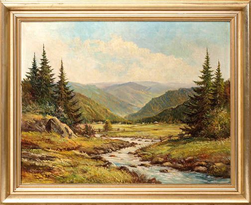 Look at a wide Schwarzwaldtal through which a stream meanders