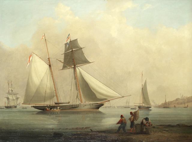 | A schooner of the Royal Yacht Squadron in Osborne Bay off Cowes with Norris Castle in the distance | |