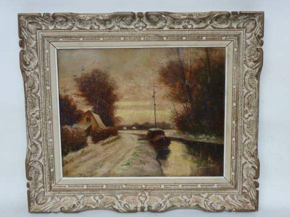 Péniche sur le canal par temps de neige