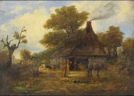 | Rural landscape with figures at a cottage door amongst trees with farm animals nearby | |