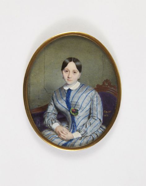 | Portrait de jeune femme en robe grise rayée bleue, assise dans un fauteuil | |