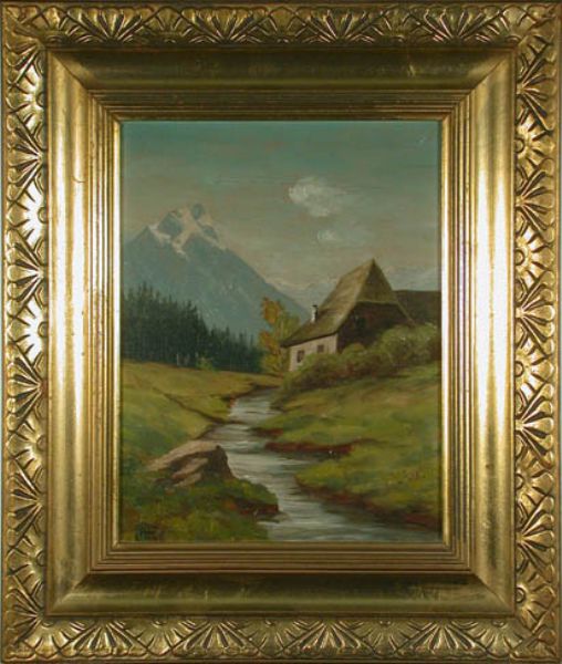 | Frühsommerliche Berglandschaft, im Vordergrund ein einsames Bauerngehöft an einem kleinen Bach | |