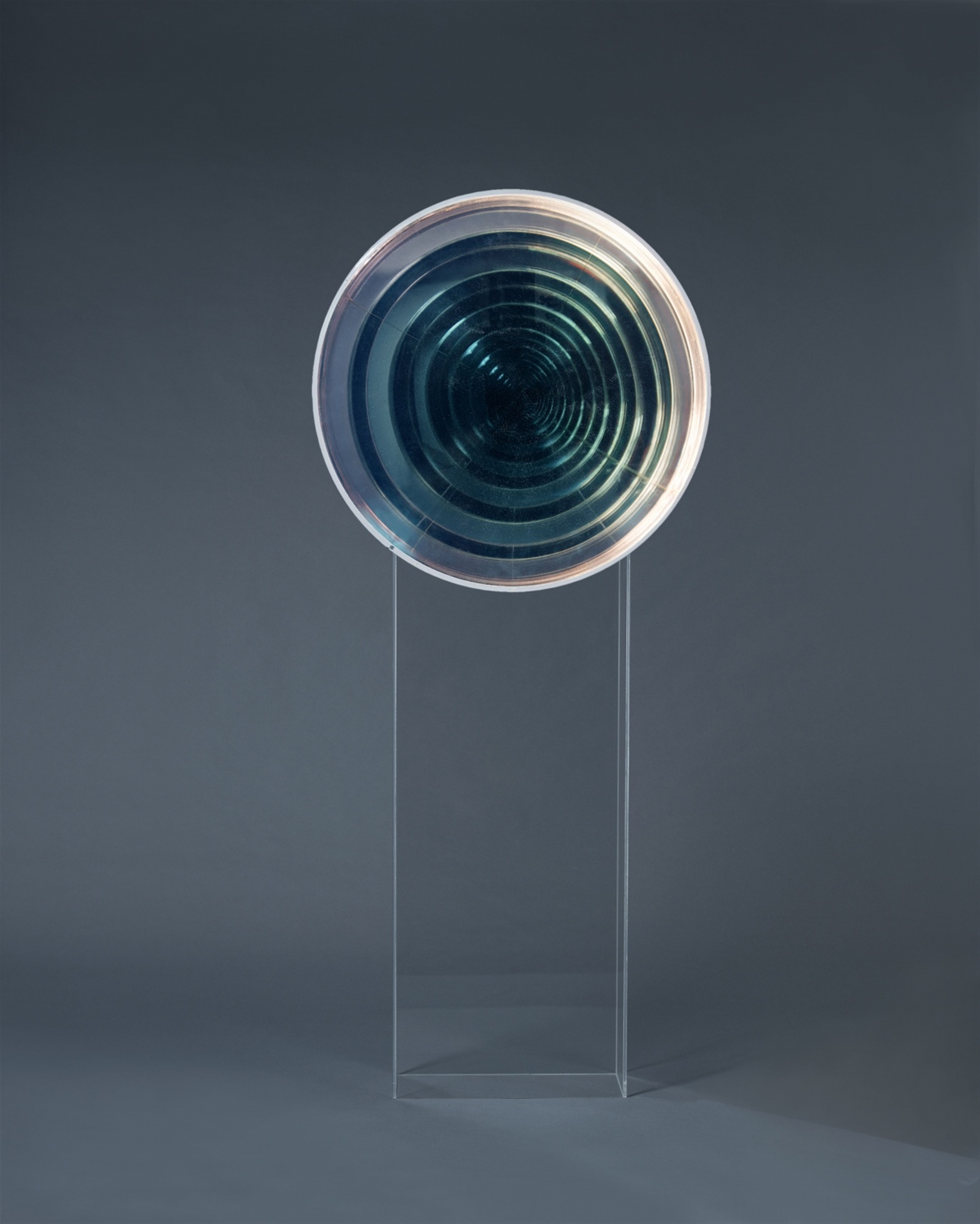 Unknown Round concave mirror with Fresnel lens backed with fluorescent tube on wood
