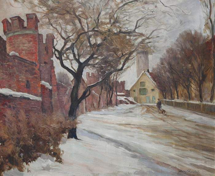 Winterliche Stadtmauer mit Personenstaffage und Kirche