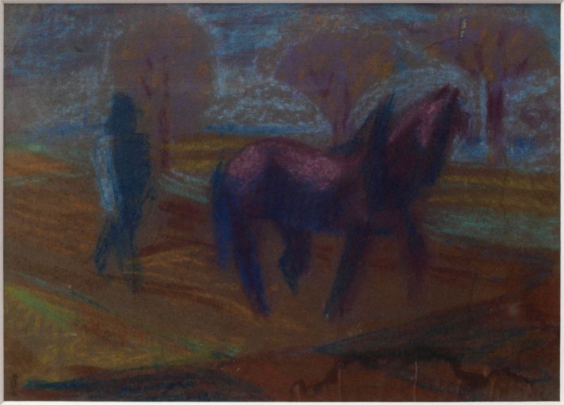 Pflügender Bauer mit Pferd, im Hintergrund Bäume am Wegrand