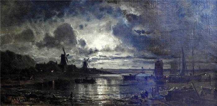 Uferstück mit Windmühlen, Booten und Personenstaffage bei malerischer Vollmondbeleuchtung