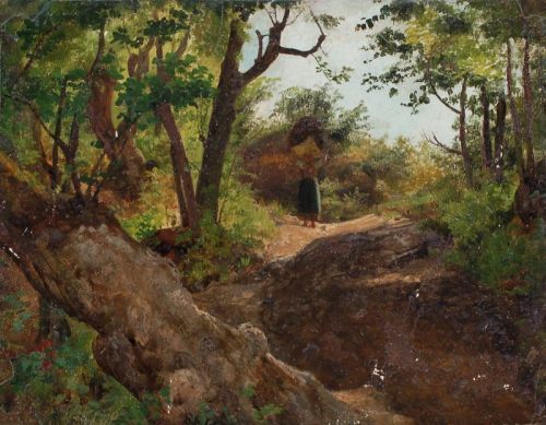 Waldszene mit korbtragender Frau