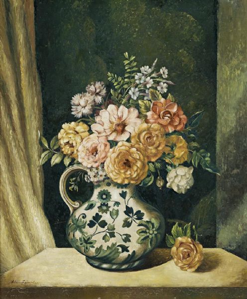 STILL LIFE OF MIXED BLOOMS IN PORCELAIN JUG