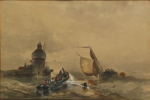 | Rescue boat rowing towards a small sailing vessel on a choppy sea, a lighthouse to the left | |