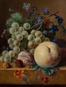 | Still life with flowers and fruit on a plinth | |