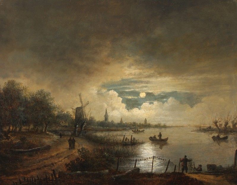 | Landscape by night beneath a heavily clouded sky and full moon. On the right a river scene with fishermen, on the left a town an | |