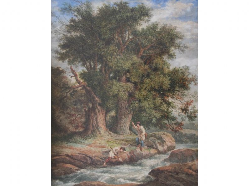 | WOODED LANDSCAPE WITH TWO BOYS FISHING IN A STREAM | |