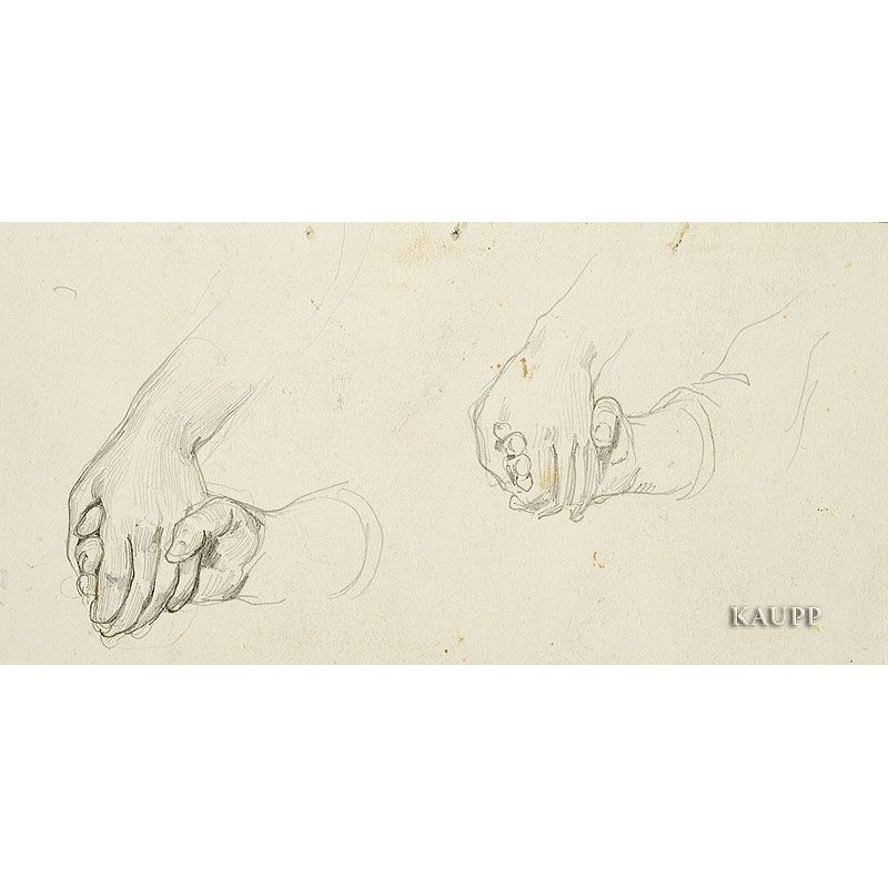 Zwei Skizzen auf einem Blatt, je Erwachsenenhand, Kinderhand haltend