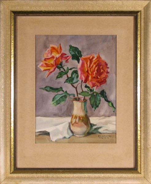 Voll erblühter Rosenzweig in Tonvase auf einem Tisch mit gefälteltem Tuch