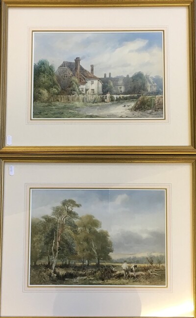 | House on a rural country lane and country scene with two workermen next to a felled tree | |