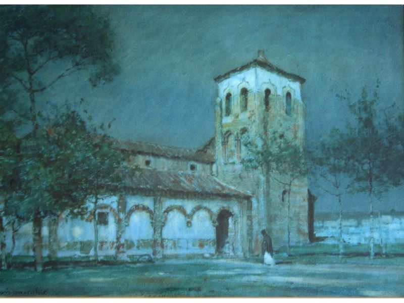 FIGURE BY A CHURCH, TWILIGHT, SPAIN (?)