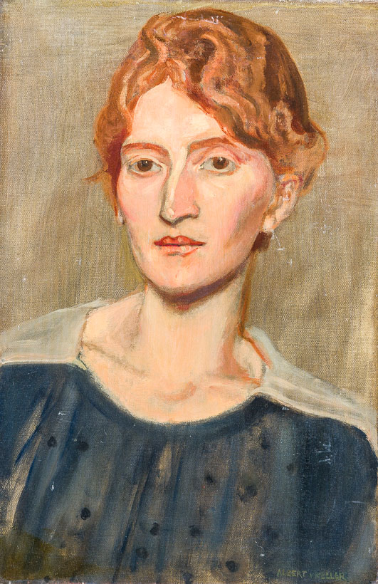 Rothaarige Dame. In schwarzem Kleid mit Punkten und weißem Kragen