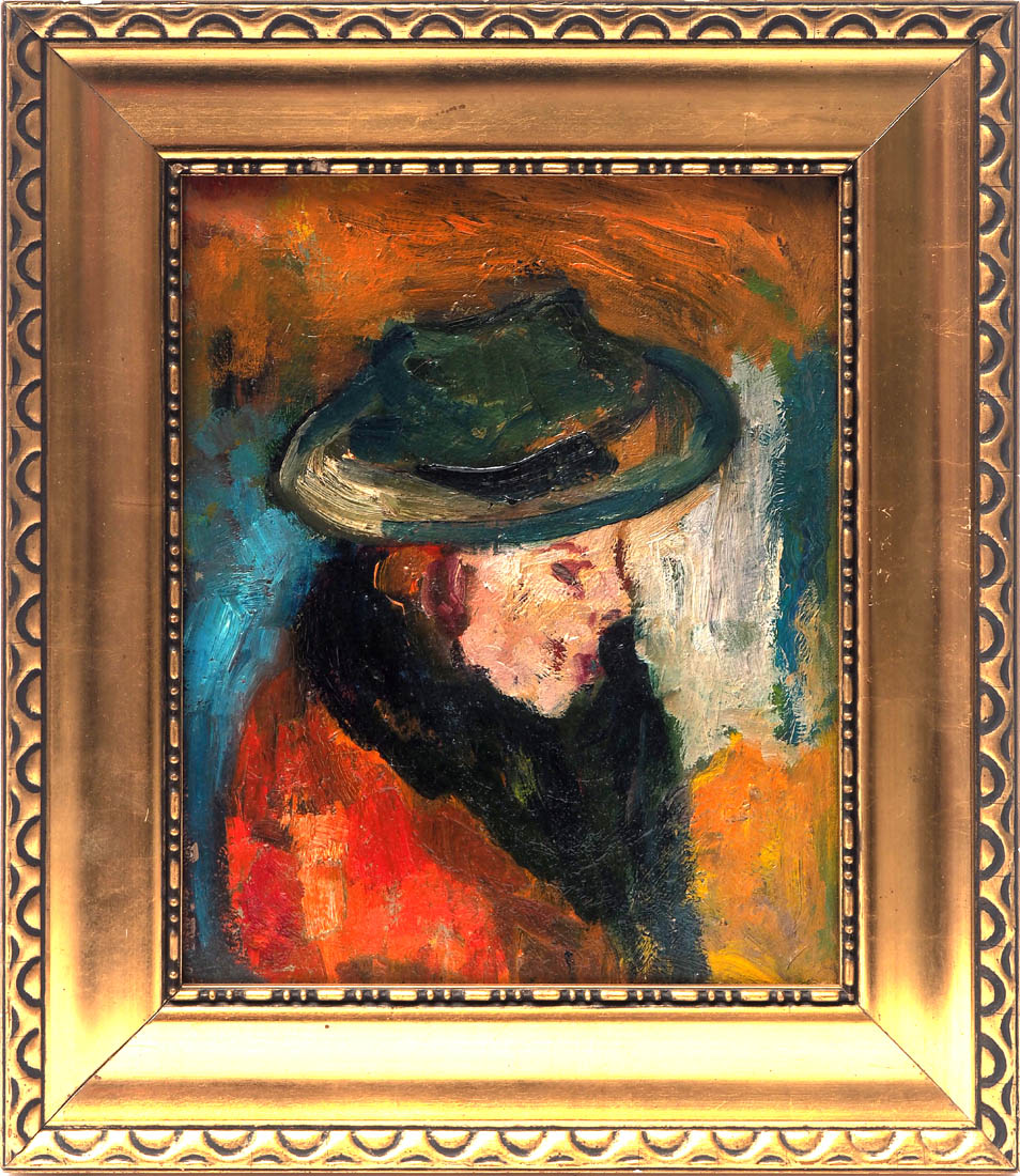 | Brustbild einer Frau im pelzbesetzten Mantel mit grünem Hut vor changierendem Hintergrund | |