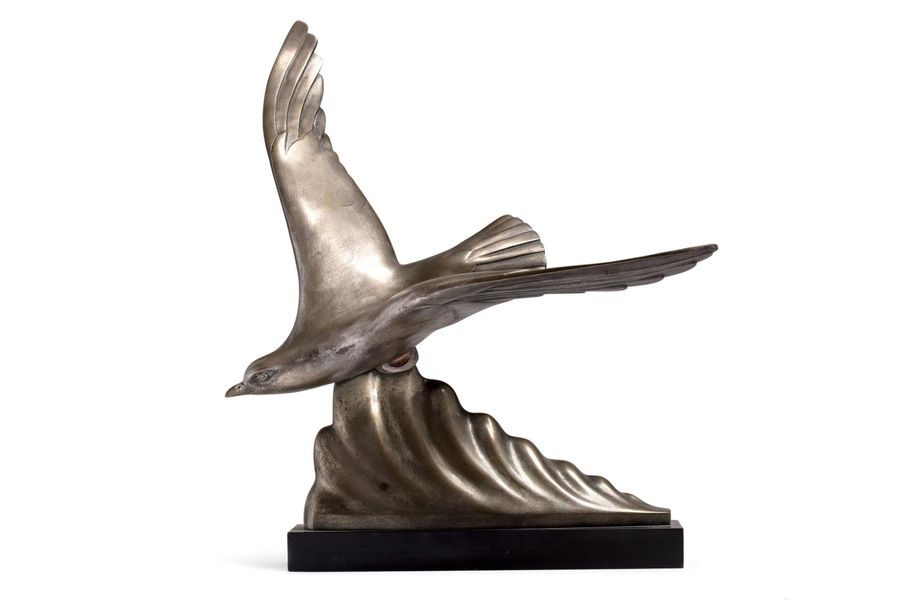 | Bronze à patine argenté figurant une mouette volant au-dessus d'une vague. Socle en marbre noir. | |