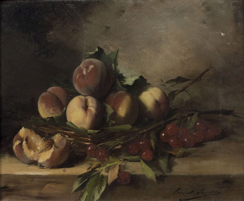 NATURE MORTE AU PANIER DE PECHES ET CERISES.
