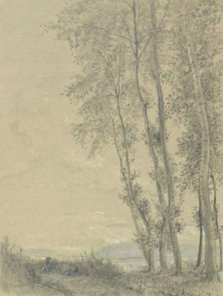 PAYSANS RAMASSANT DU BOIS PRES D'UN LAC AUX GRANDS ARBRES