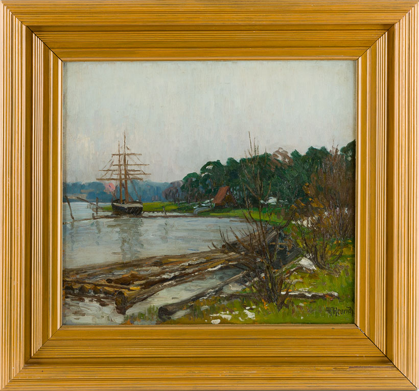 Ankernder Zweimaster in kl. Bucht an Flussufer