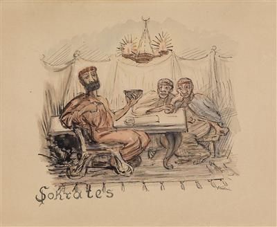 Pen and ink and watercolour on paper, laid down on cardboard, framed