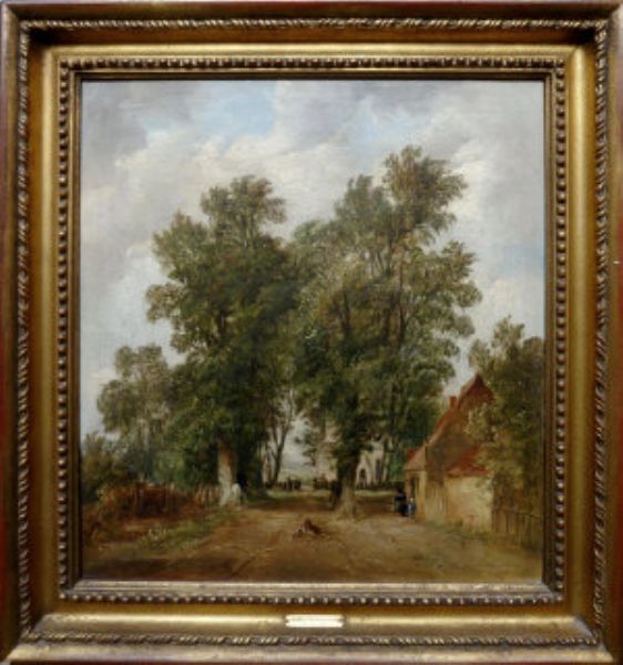| Two dogs playing in a wooded country lane with figures and a church beyond | |