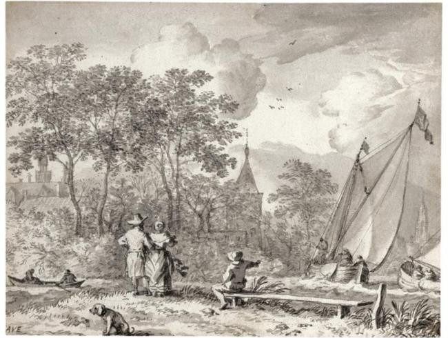 | LANDSCAPE WITH ELEGANT FIGURES BY A RIVER, WITH BOATS TO THE RIGHT AND A TOWN BEHIND TREES BEYOND | |