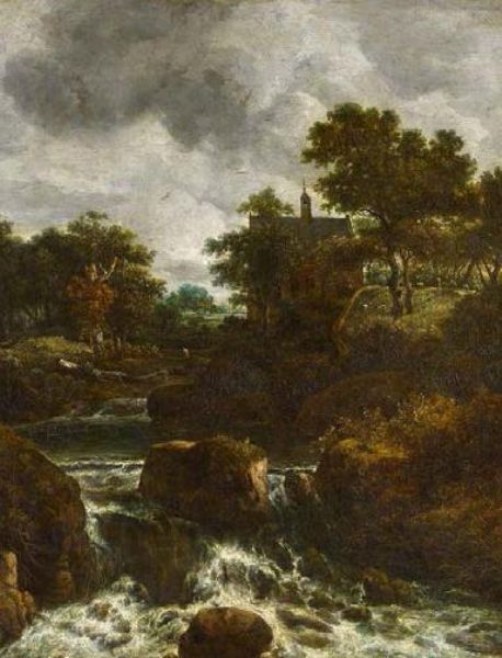 Bewaldete Landschaft mit Wasserfall und alter Kirche