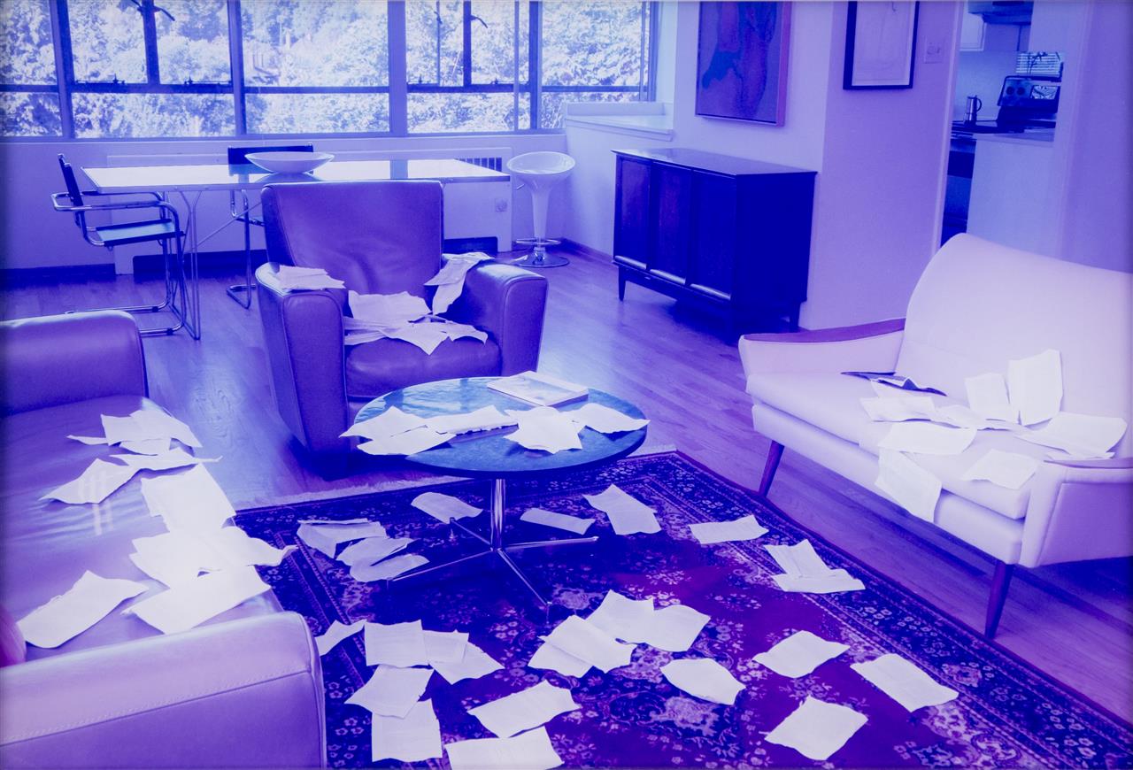 | living room strewn with pages from a ruined book (the pornographer's poem by michael turner | |
