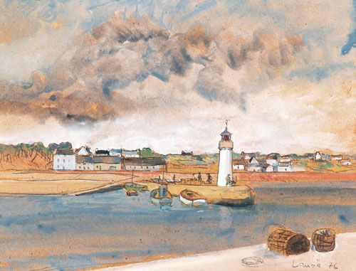 Blick auf ein Küstenstädtchen mit Leuchtturm, im Hafen drei Fischerboote
