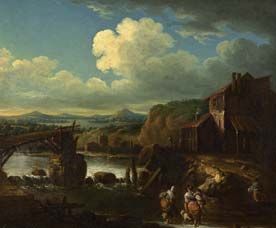Idyllische Landschaft mit Flusslauf unter halb eingestürzter Brücke.