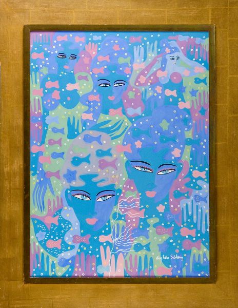 Kvinnoansikten i blått undervattenslandskap med fiskar.