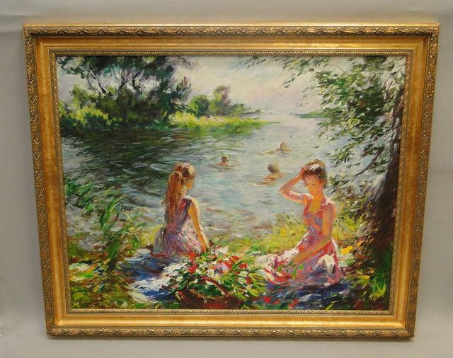 motiv av 2 sittande kvinnor vid flod samt 3 simmande figurer