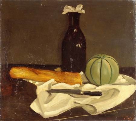 MELON, FLACON, COUTEAU ET PAIN SUR UNE NAPPE,